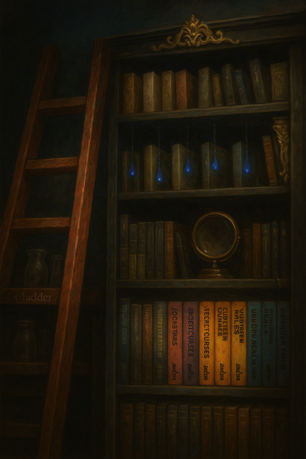 The ladder creaked as he leaned against it, returning The Hobbit to its shelf. The spine slid neatly into place, the sound small and final, like a door closing on the past.